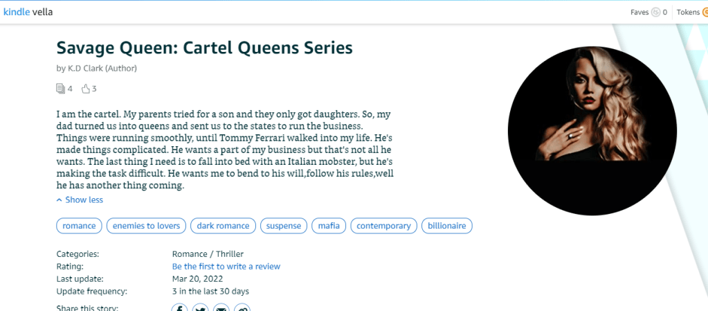 Kindle Vella Stories Share this: Click to share on X (Opens in new window) X Click to share on Facebook (Opens in new window) Facebook Like Loading...